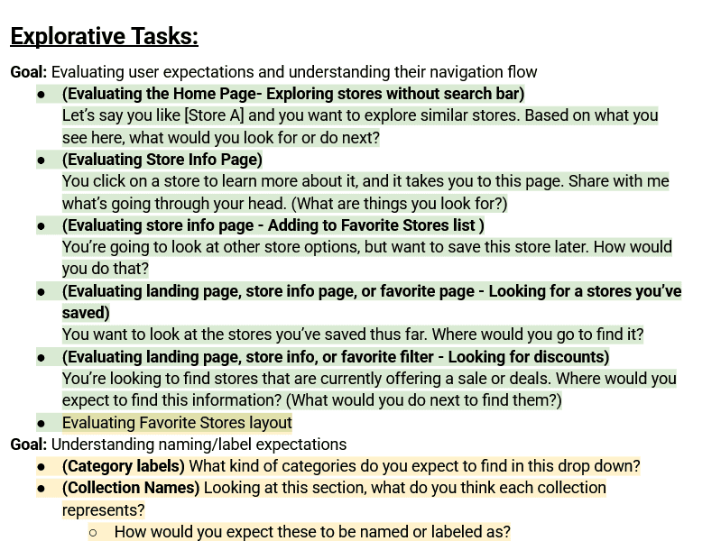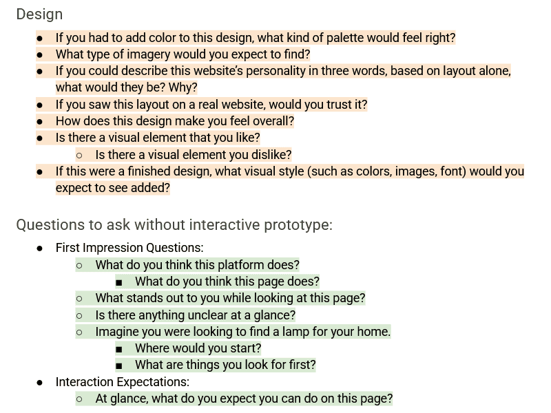 We determined, based on our client meeting, that these pages were a high priority for the client. Each of these three pages encapsulated various features that the client highlighted were important to SHOPORG’s platform. Together, our team generated a variety of questions ranging from gathering first impressions to user speculation of a page’s purpose to what color palette participants expect to see with this platform.