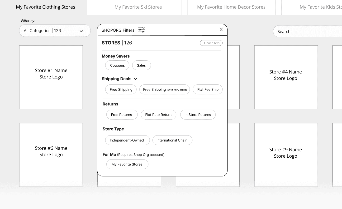 Part of SHOPORG’s smart technology is its granular filtering system. Participants liked the filters, but participants found hiding the filters in a dropdown menu counterintuitive. The organization of the filters was unfamiliar to them and required reopening the dropdown to confirm which filters were applied.