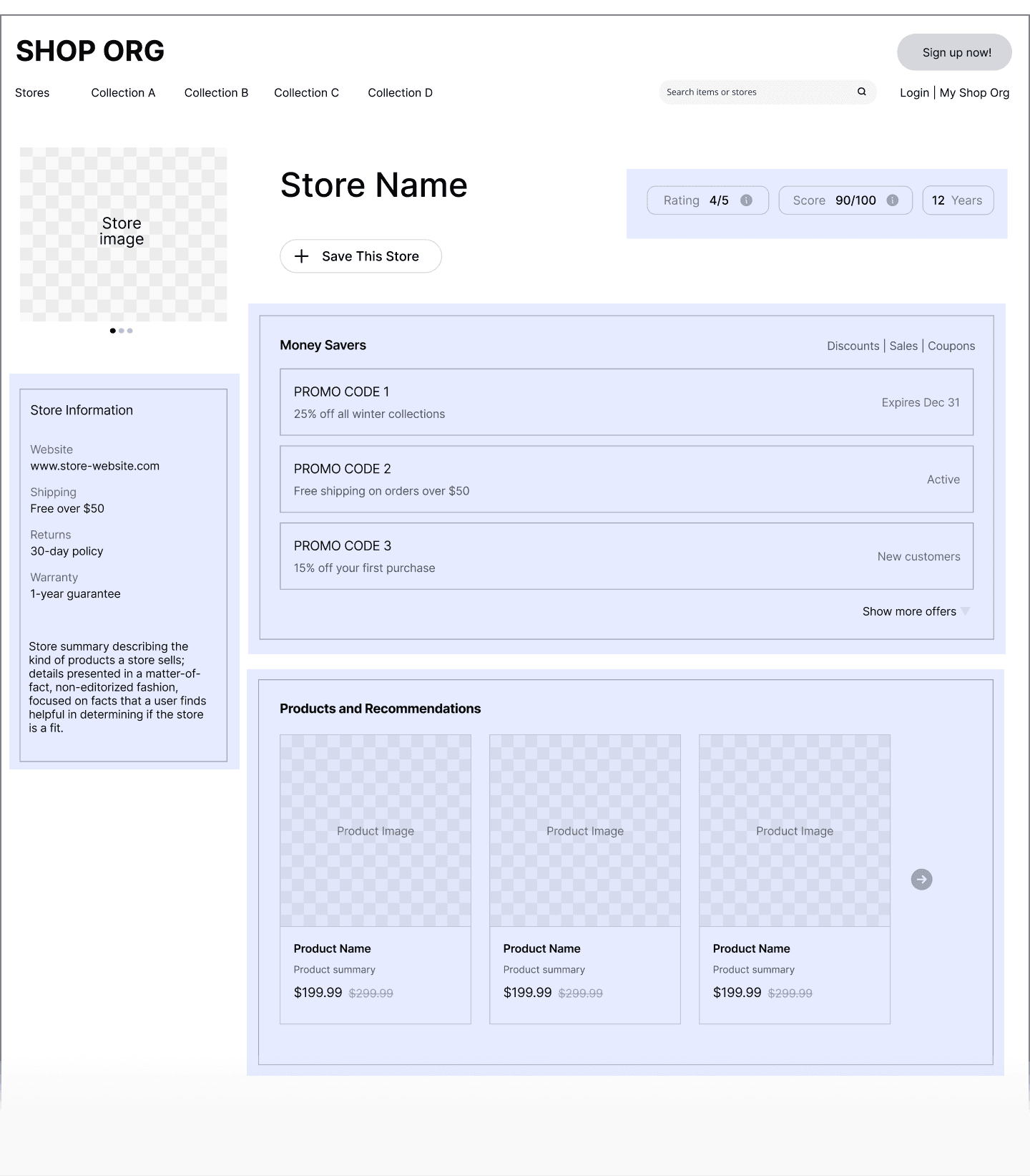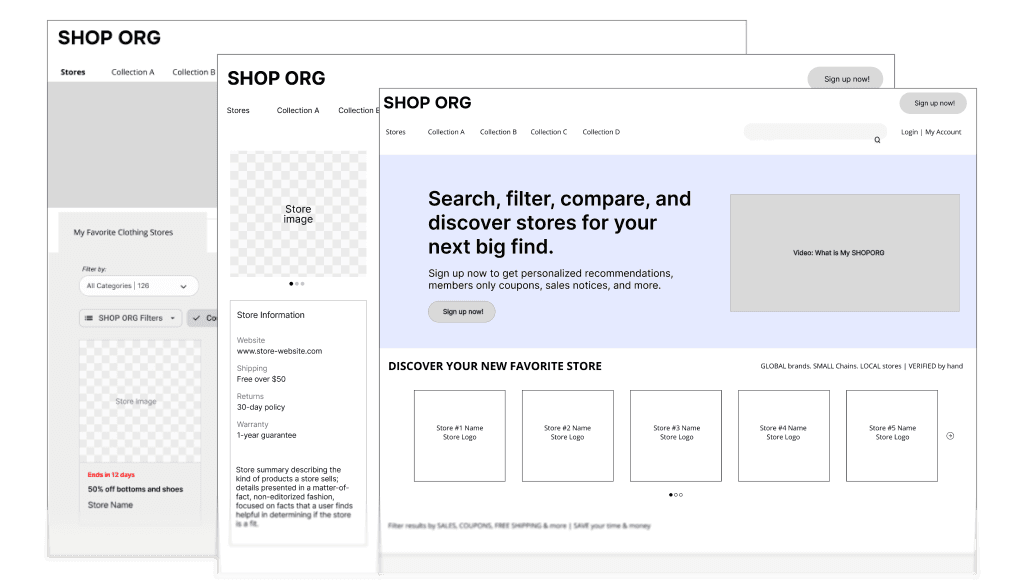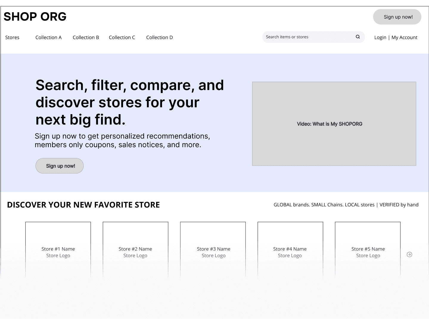 SHOPORG is a Los Angeles-based startup seeking to redefine online shopping through smart technology that supports a personalized experience. Before the full launch of their platform, they wanted to ensure their website design aligned with user expectations. Our team’s usability testing uncovered confusion with the platform’s features, as well as a lack of visibility for what users valued. We made recommendations across three webpages to improve the overall discoverability of SHOPORG's features and offerings.