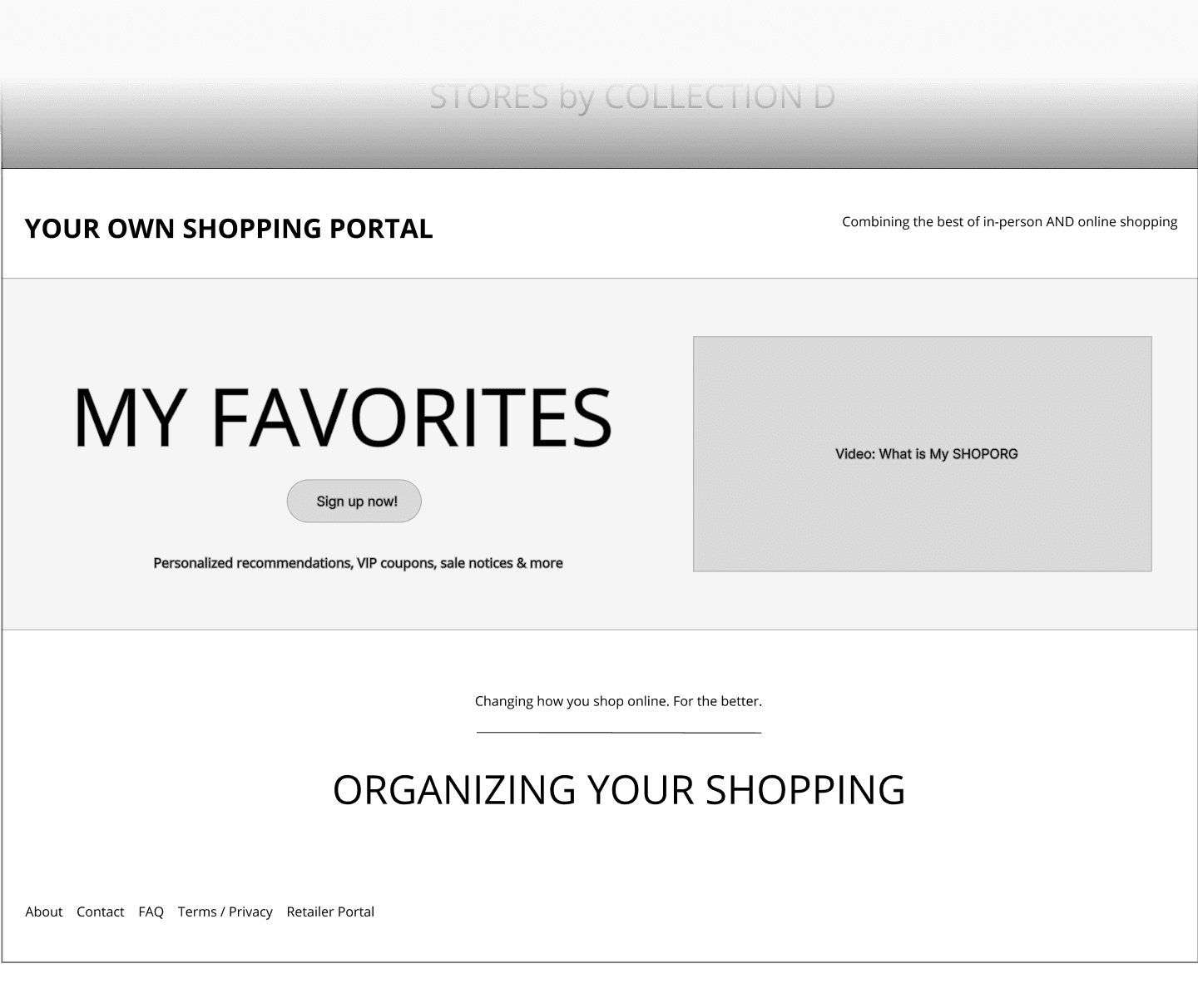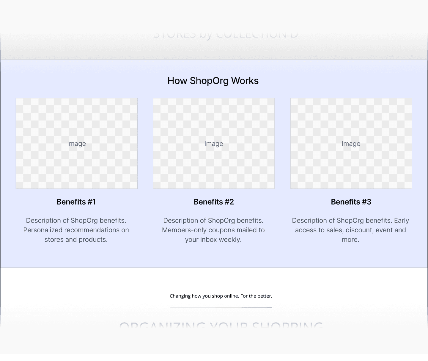 Using what already exists, we suggest moving the information section to the top of the homepage and adding a short and bold tagline so users can immediately discover how SHOPORG can support their online shopping.
