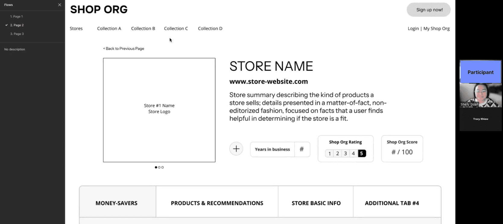 After completing a pilot test and finalizing the script, we conducted moderated testing sessions over Zoom within one week. Participants first completed a pre-test questionnaire to provide insight into their online shopping behaviors. Then proceeded to complete the ten tasks across the three webpages, focused on evaluating their search behavior, first impressions, expectations, and comprehension of SHOPORG’s features.